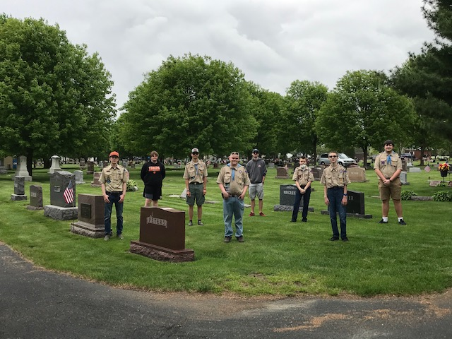 On Friday, May 22, seven Scouts and five Scouters helped VFW and American Legion volunteers place approximately 180 metal gravesite markers and American flags on the graves of the brave men and women who served our country and are interned at The Corinthi
