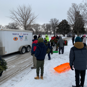 Scouts and adults from the Troop provided service by helping remove the wreaths from the graves at Fort Snelling Veterans Cemetery. Thank you!